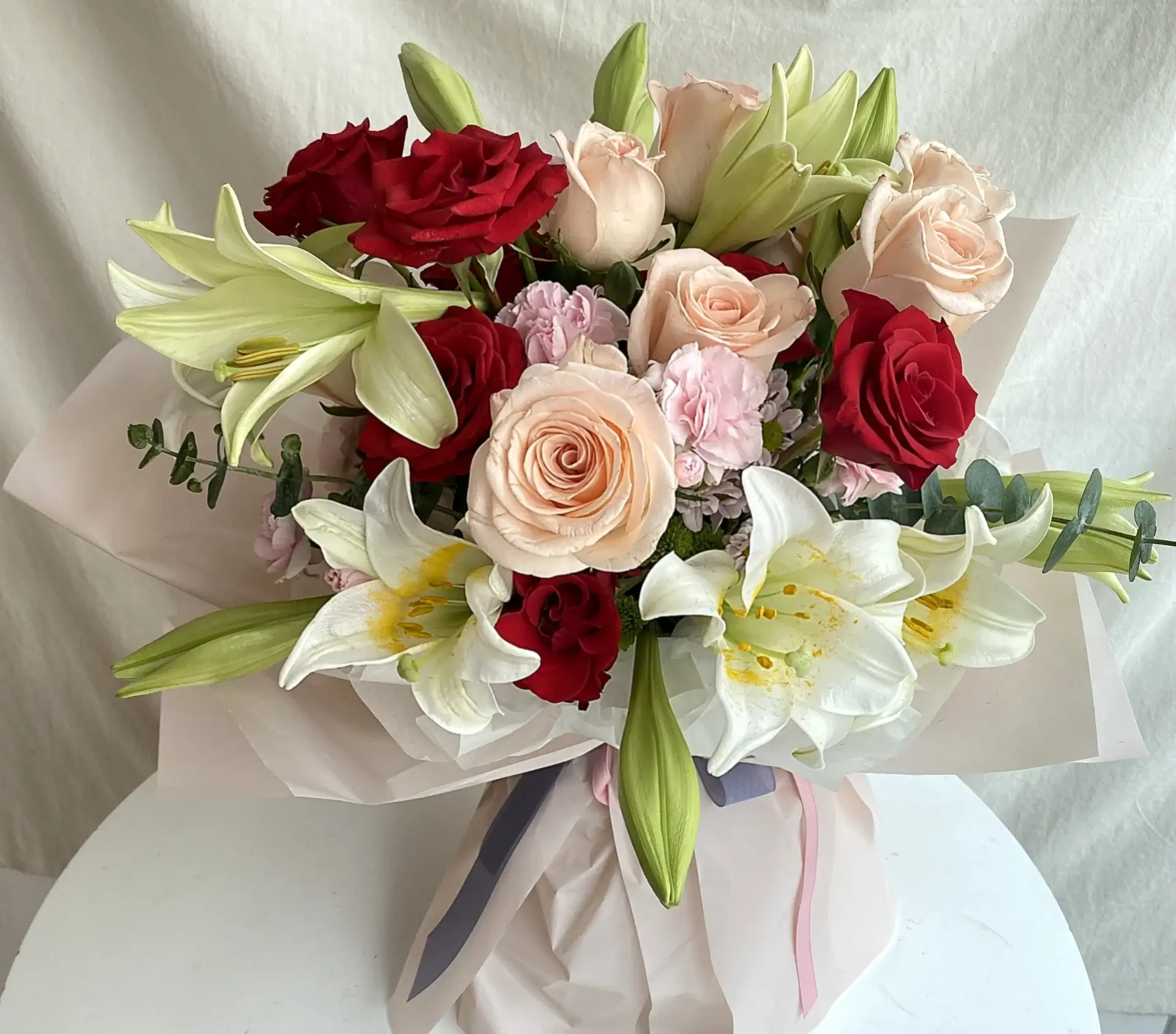 Eelegant composition of red roses, peach roses and blooming white lilies, accented with carnations and seasonal greenery.
