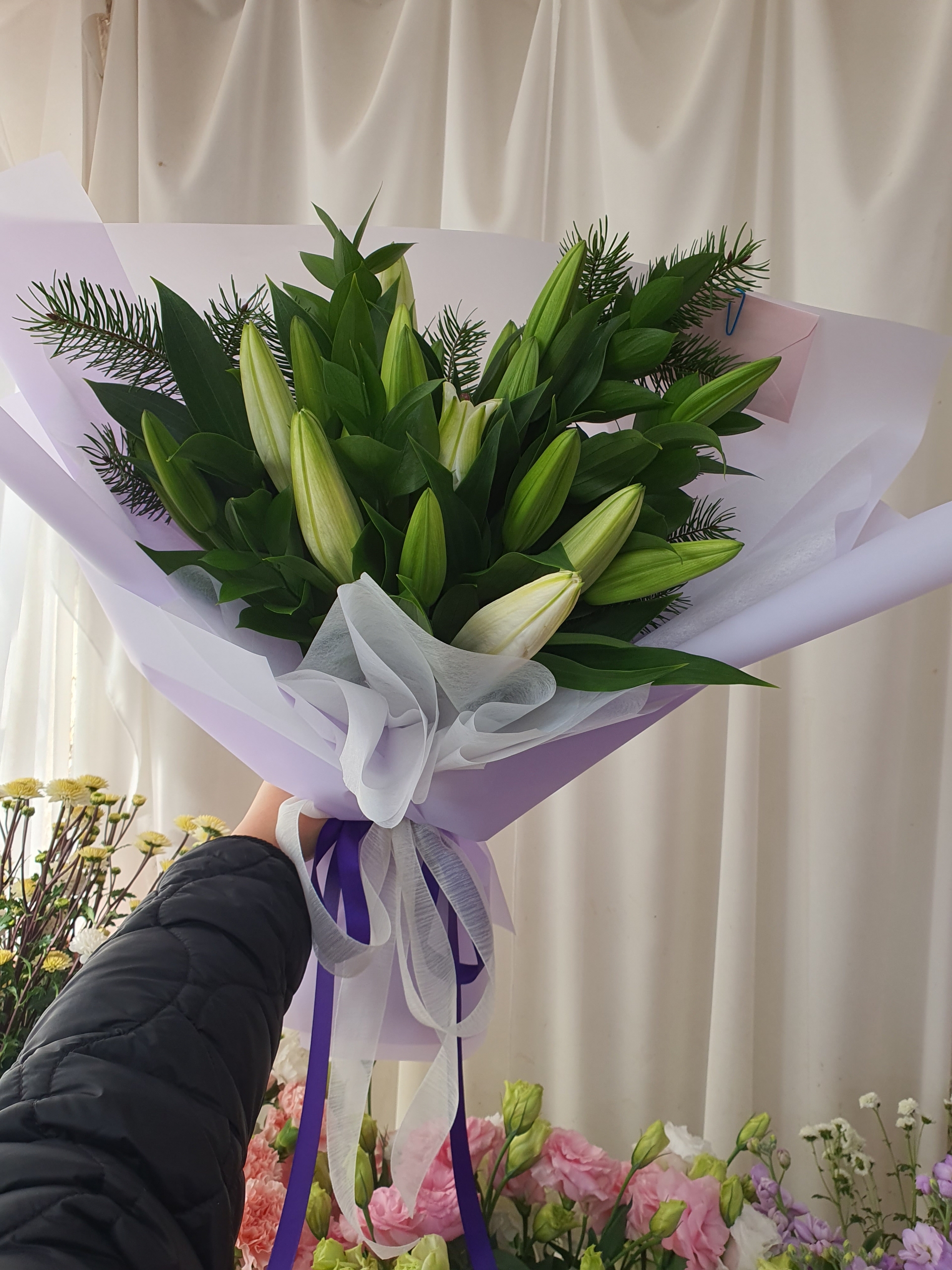 Meaning: Purity & devotion Description: Clean and elegant lilies delivering calm and sincere feelings. A beautiful choice for weddings, anniversaries, and blessings.